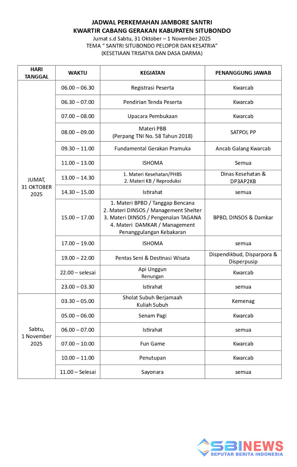 SITUBONDO (SBINews.id) – Kwartir Cabang (Kwarcab) Gerakan Pramuka Situbondo menutup rangkaian kegiatan Jambore Santri ke-1 Tahun 2025 dengan upacara Api Unggun yang berlangsung khidmat dan penuh makna di Alun-alun Kota Situbondo, Jumat malam (31/10/25). Upacara malam puncak ini dipimpin langsung oleh Ketua Kwarcab Pramuka Situbondo, Kak Ulfiyah, yang juga menjadi pembina upacara.