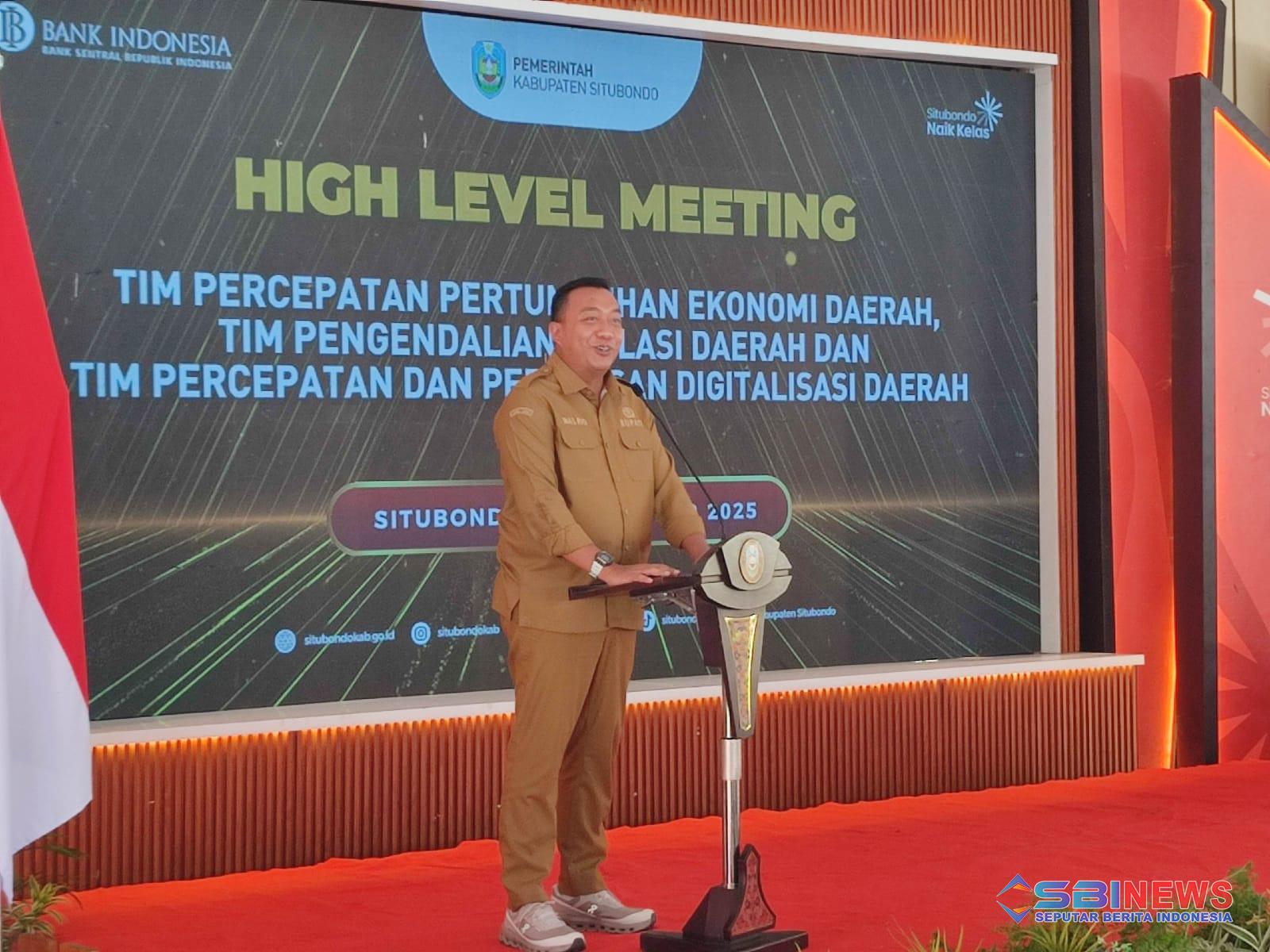 Kepala Bapperida Kabupaten Situbondo, drs. H. Sugiyono, M.Pd.I., dalam sambutannya menegaskan bahwa High Level Meeting ini merupakan tindak lanjut dari pertemuan serupa yang sebelumnya digelar oleh Pemerintah Provinsi Jawa Timur bersama Bank Indonesia Jawa Timur pada 25 November 2025. Ia menilai penting adanya penyelarasan kebijakan pusat, provinsi, dan daerah agar arah pembangunan ekonomi berjalan seirama.