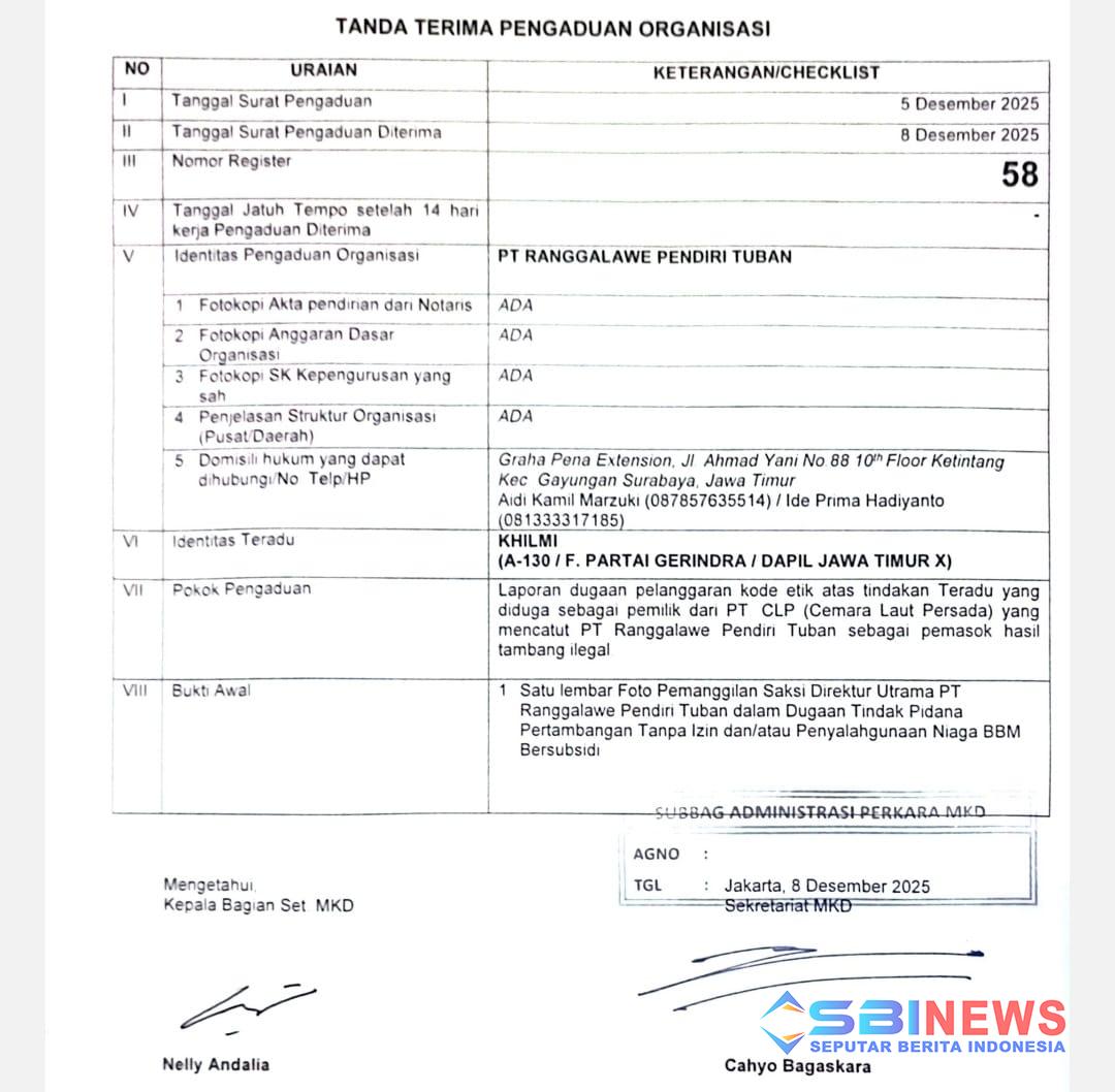 Ide menambahkan, substansi pengaduan telah dicatat secara rinci dalam tanda terima laporan, yakni dugaan pelanggaran kode etik oleh teradu Khilmi. Dalam pengaduan itu, Khilmi diduga sebagai pemilik PT Cemara Laut Persada (CLP) yang mencatut nama PT Ranggalawe Pendiri Tuban sebagai pemasok hasil tambang ilegal.