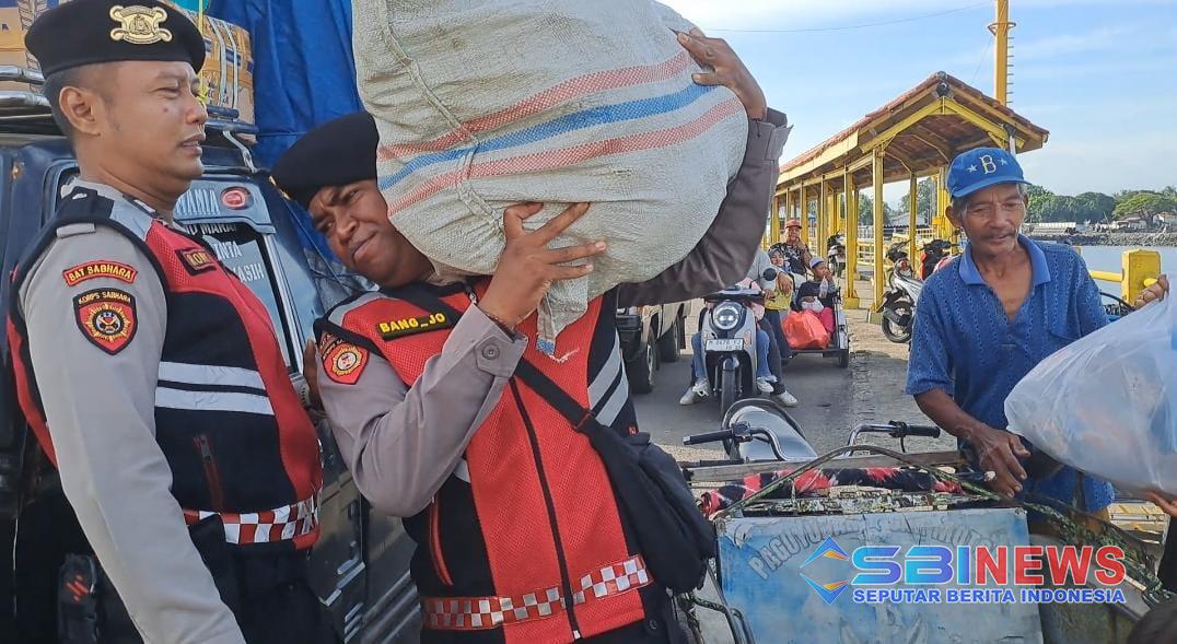 Tidak hanya melakukan pengamanan, petugas juga turun langsung membantu masyarakat, mulai dari mengangkat barang bawaan penumpang yang turun dari kapal hingga membantu penumpang yang hendak naik kapal tujuan Pulau Raas, Kabupaten Sumenep.