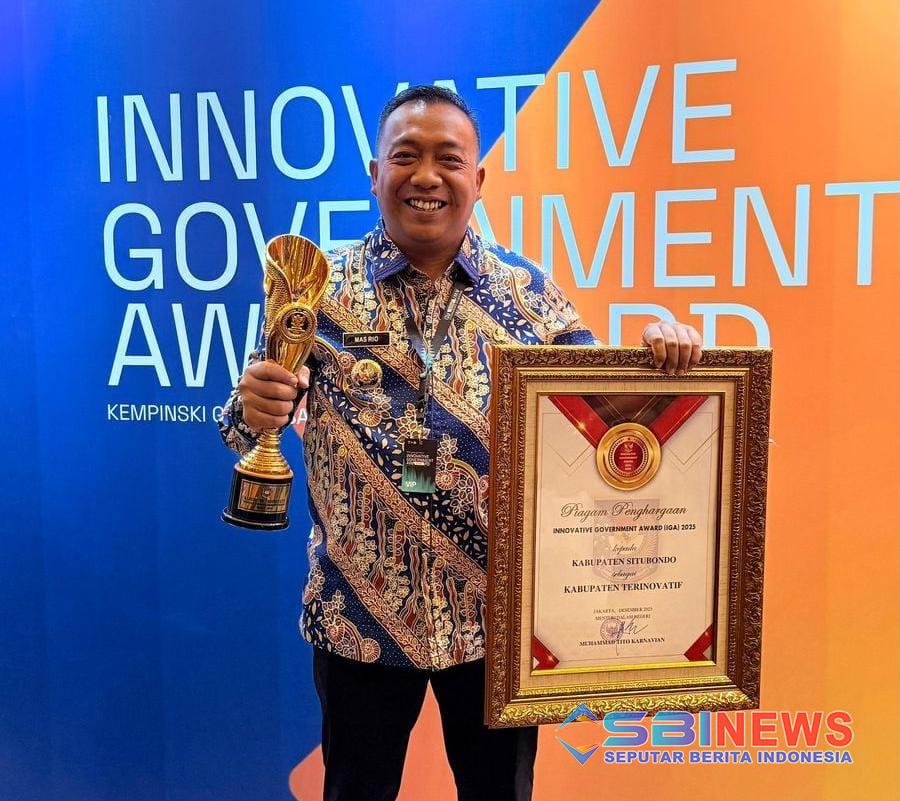 SITUBONDO (SBINews.id) – Kabupaten Situbondo kembali menorehkan prestasi gemilang di kancah nasional. Kementerian Dalam Negeri (Kemendagri) secara resmi menetapkan Situbondo sebagai Kabupaten Terinovatif dalam ajang bergengsi Innovation Government Award (IGA) 2025. Penghargaan ini diterima langsung oleh Bupati Situbondo, Yusuf Rio Wahyu Prayogo -yang akrab disapa Mas Rio– di Jakarta, pada Rabu, 10 Desember 2025.