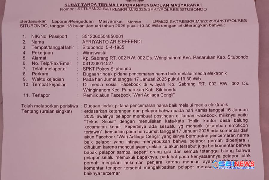 Afriyanto Aris Effendi, yang lebih dikenal dengan nama Tekos Sosial, resmi melaporkan akun Facebook bernama Wari Adilaga Cengli (WAC) ke Polres Situbondo atas dugaan tindak pidana pencemaran nama baik.